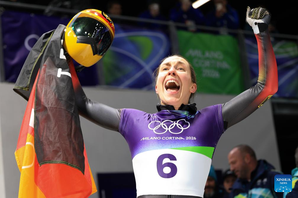 CORTINA D'AMPEZZO, 15 febrero, 2026 (Xinhua) -- Imagen del 14 de febrero de 2026 de Jacqueline Pfeifer, de Alemania, reaccionando durante la serie de skeleton femenino en los Juegos Olímpicos de Invierno Milán-Cortina 2026, en Cortina, Italia. (Xinhua/Ding Xu)