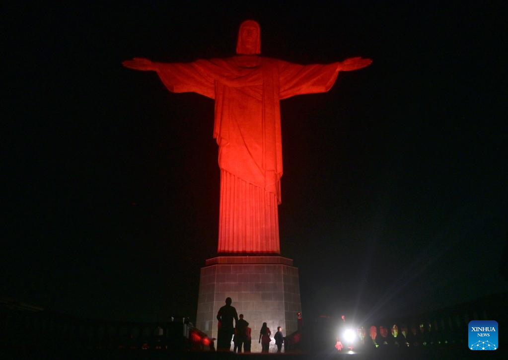 RIO DE JANEIRO, 17 febrero, 2026 -- Imagen del 16 de febrero de 2026 de la estatua del Cristo Redentor iluminado de rojo para celebrar el Año Nuevo chino, en Río de Janeiro, Brasil. (Xinhua/Lucio Tavora)