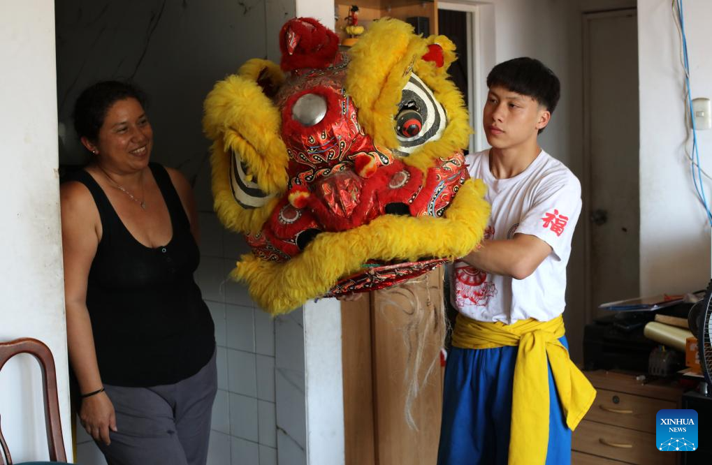LIMA, 17 febrero, 2026 (Xinhua) -- Imagen del 9 de febrero de 2026 de Gonzalo Zhou, un joven peruano de 17 años de edad, hijo de padre chino y madre peruana con raíces chinas, preparándose para ensayar la danza del león en su casa, en Lima, Perú. La Fiesta de la Primavera es, para muchas personas en Perú, una celebración que se expresa a través del movimiento, el sonido de los tambores y la reunión colectiva, donde la danza del dragón, el león y la cena que reúne a las familias se convierten en un lenguaje que transmite buenos deseos, memoria y renovación. (Xinhua/Mariana Bazo)