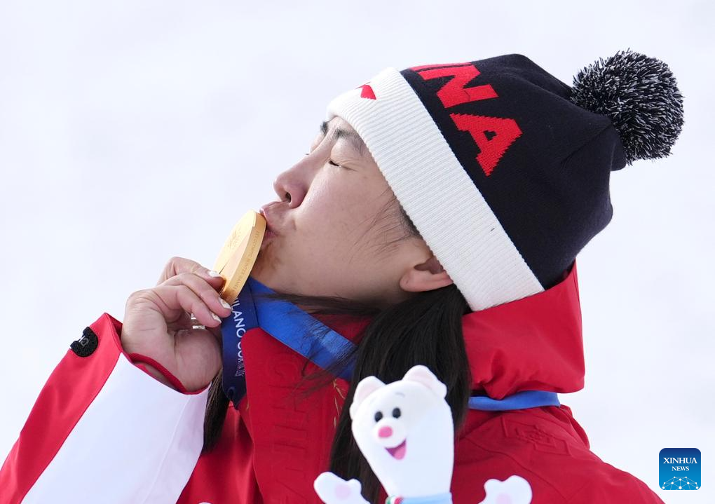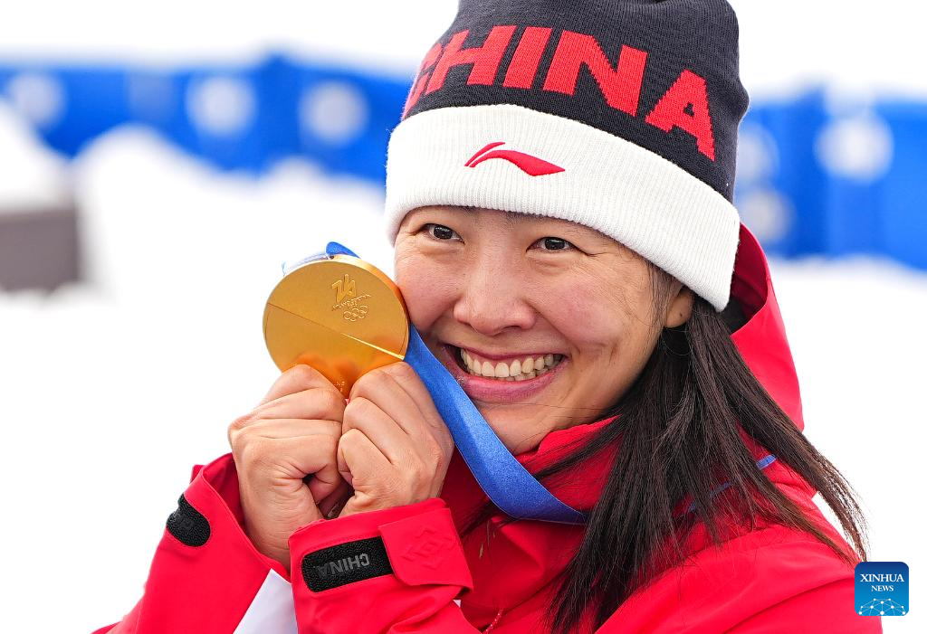 LIVIGNO, 18 febrero, 2026 (Xinhua) -- La medallista de oro, Xu Mengtao, de China, besa su medalla durante la ceremonia de premiación de aerials femenino de esquí acrobático en los Juegos Olímpicos de Invierno Milán-Cortina 2026, en Livigno, Italia, el 18 de febrero de 2026. (Xinhua/Hu Chao)