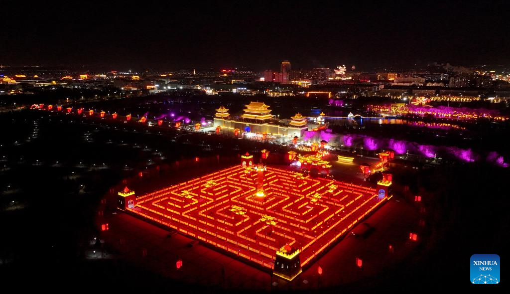 BEIJING, 19 febrero, 2026 (Xinhua) -- Vista aérea tomada con un dron el 18 de febrero de 2026 de una vista nocturna en el distrito de Yanchi, en la región autónoma hui de Ningxia, en el noroeste de China. Durante la Fiesta de la Primavera, las decoraciones de linternas a través del país crearon un alegre ambiente para la celebración. (Xinhua/Feng Kaihua)