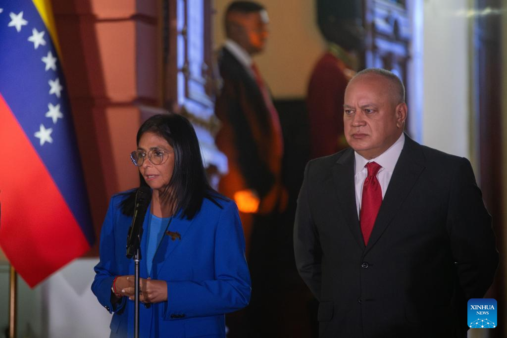 Imagen del 19 de febrero de 2026 de la presidenta encargada venezolana, Delcy Rodríguez (i), hablando durante una conferencia de prensa después de promulgar la Ley de Amnistía para la Convivencia Democrática, en Caracas, Venezuela. Rodríguez promulgó el jueves la recién aprobada Ley de Amnistía para la Convivencia Democrática que, a su juicio, significa "una nueva etapa" en la vida nacional del país sudamericano. (Xinhua/Marcos Salgado)