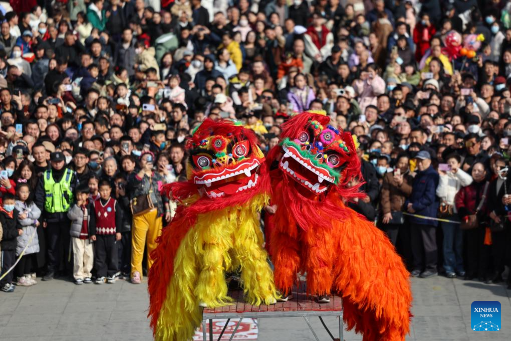 BEIJING, 19 febrero, 2026 (Xinhua) -- Imagen del 18 de febrero de 2026 de una presentación de la danza de león llevada a cabo en el distrito de Jinhu de Huaian, en la provincia de Jiangsu, en el este de China. Durante la Fiesta de la Primavera, varias actividades folclóricas y presentaciones se llevan a cabo a través de China. (Xinhua/Chen Yibao)