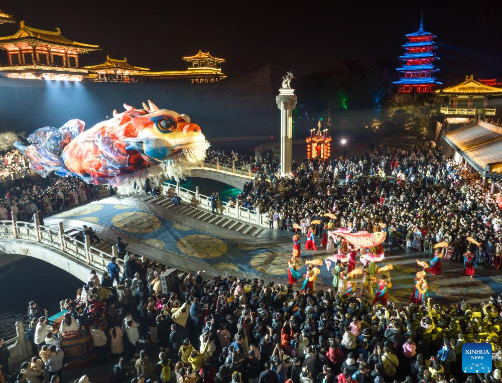 BEIJING, 20 febrero, 2026 (Xinhua) -- Vista aérea tomada con un dron el 19 de febrero de 2026 de turistas observando una presentación en un área escénica, en la ciudad de Xiangyang, en la provincia de Hubei, en el centro de China. El Ministerio de Cultura y Turismo de China lanzó una campaña cultural y turística de un mes de duración previo a la Fiesta de la Primavera, que incluye una amplia gama de actividades y medidas promocionales para satisfacer mejor las necesidades de la población. (Xinhua/Yang Dong)