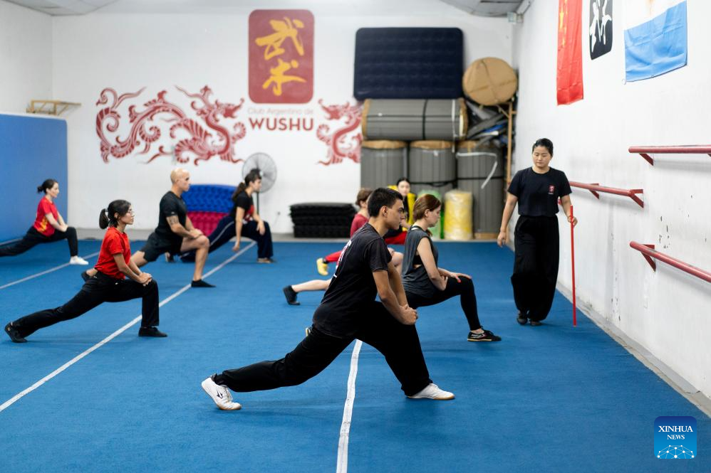BUENOS AIRES, 18 febrero, 2026 (Xinhua) -- Imagen del 4 de febrero de 2026 de Marcos González (c-frente), un joven de 14 años de edad y practicante de wushu, participando en una sesión de entrenamiento ante la mirada de la maestra, Chen Min (d), en el Club Argentino de Wushu, en la ciudad de Buenos Aires, capital de Argentina. La milenaria cultura china y sus múltiples manifestaciones, como la Fiesta de la Primavera, el arte, la música, la danza y el deporte marcial, atrae y enamora a los jóvenes de Argentina, que se suman con entusiasmo, respeto y admiración a la práctica de distintas disciplinas, costumbres y celebraciones originarias del país asiático. (Xinhua/Martín Zabala)