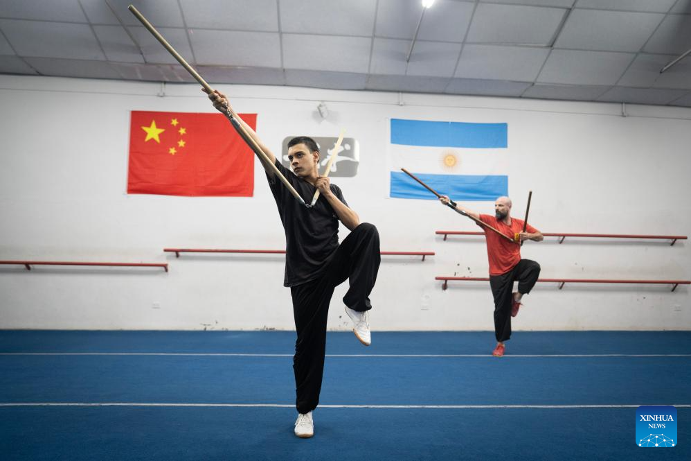 BUENOS AIRES, 18 febrero, 2026 (Xinhua) -- Imagen del 4 de febrero de 2026 de Marcos González (i), un joven de 14 años de edad y practicante de wushu, realizando formas de "San Jie Gun" (El palo de tres secciones) durante una sesión de entrenamiento en el Club Argentino de Wushu, en la ciudad de Buenos Aires, capital de Argentina. La milenaria cultura china y sus múltiples manifestaciones, como la Fiesta de la Primavera, el arte, la música, la danza y el deporte marcial, atrae y enamora a los jóvenes de Argentina, que se suman con entusiasmo, respeto y admiración a la práctica de distintas disciplinas, costumbres y celebraciones originarias del país asiático. (Xinhua/Martín Zabala)