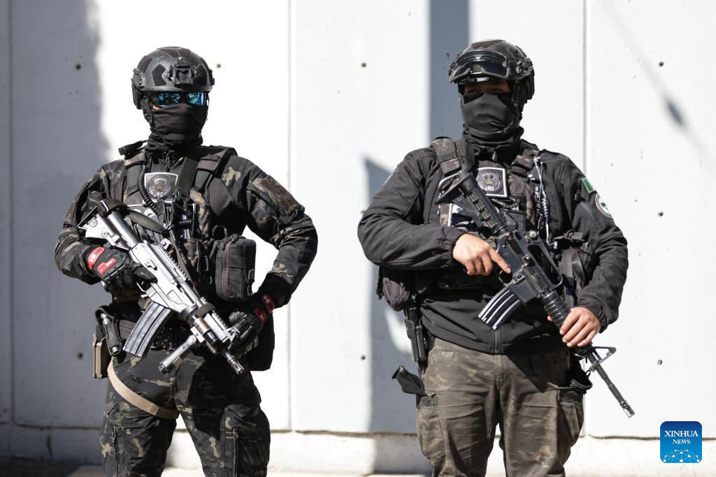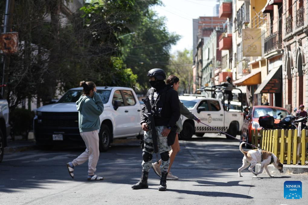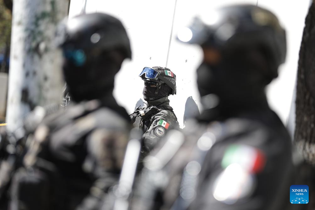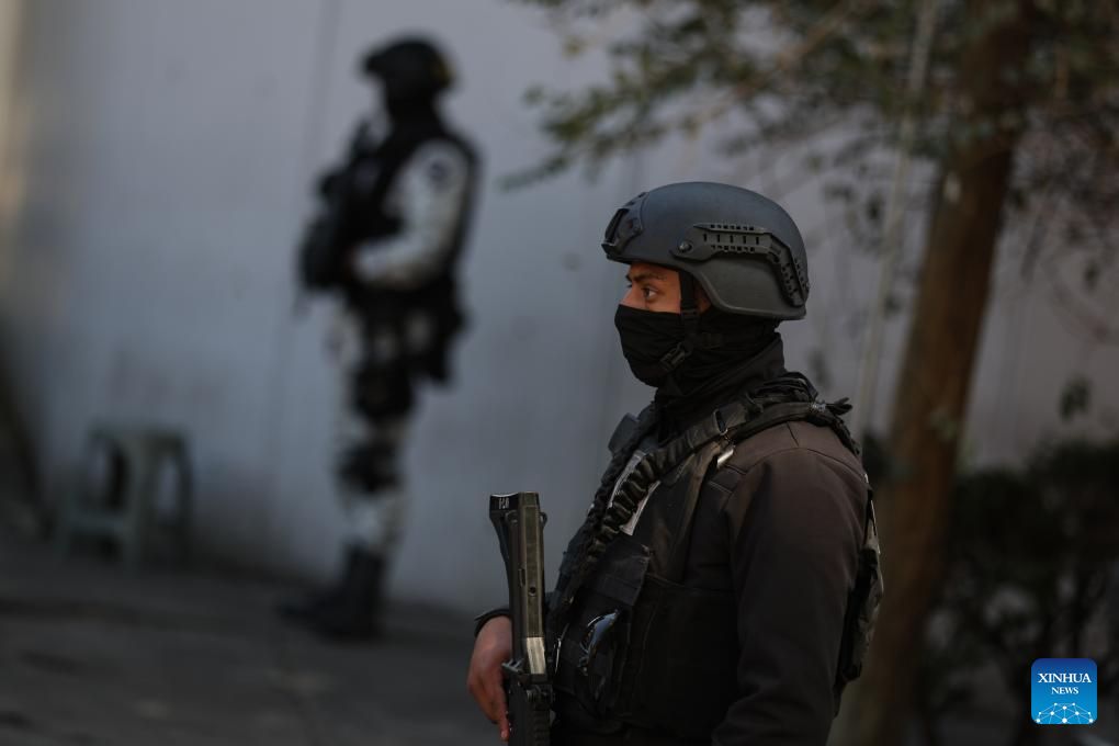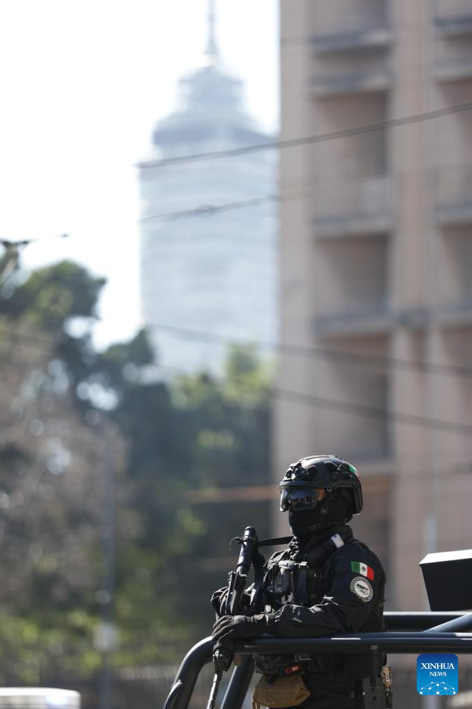 CIUDAD DE MEXICO, 23 febrero, 2026 (Xinhua) -- Elementos de la Secretaría de Seguridad y Protección Ciudadana vigilan las instalaciones de la Fiscalía Especializada en Materia de Delincuencia Organizada, en la Ciudad de México, capital de México, el 23 de febrero de 2026. La Fiscalía General de la República de México confirmó el lunes genéticamente la identidad del cuerpo del líder del Cártel Jalisco Nueva Generación, Nemesio Rubén Oseguera Cervantes, alias "El Mencho", abatido la víspera tras un operativo militar en el estado de Jalisco. (Xinhua/Francisco Cañedo)