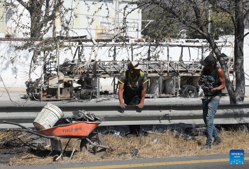 Trabajadores retiran escombros de vehículos quemados, en la ciudad de Guadalajara, capital del estado de Jalisco, México, el 24 de febrero de 2026. La presidenta mexicana, Claudia Sheinbaum, aseguró el martes que México ofrece "todas las garantías" para que se realice la Copa Mundial de Fútbol FIFA 2026, cuya etapa preliminar se jugará en las ciudades de México, Monterrey y Guadalajara, a partir de junio próximo. (Xinhua/Str)