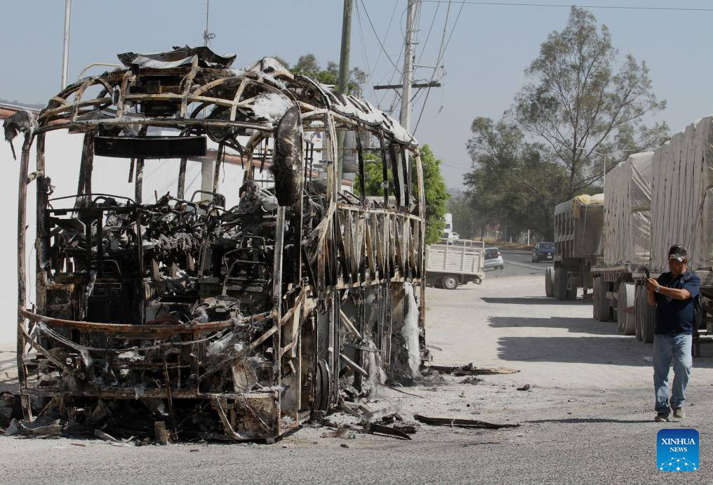 Un hombre toma una fotografía a un camión quemado, en la ciudad de Guadalajara, capital del estado de Jalisco, México, el 24 de febrero de 2026. La presidenta mexicana, Claudia Sheinbaum, aseguró el martes que México ofrece "todas las garantías" para que se realice la Copa Mundial de Fútbol FIFA 2026, cuya etapa preliminar se jugará en las ciudades de México, Monterrey y Guadalajara, a partir de junio próximo. (Xinhua/Str)