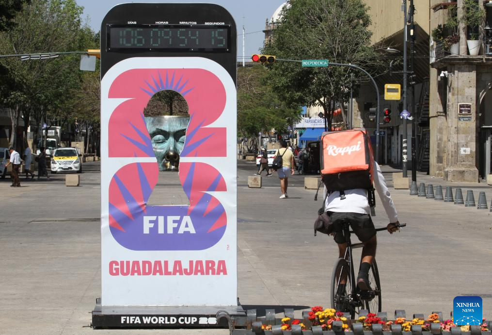 Un repartidor de comida circula en una bicicleta junto a un anuncio de la Copa Mundial de Fútbol FIFA 2026, en la ciudad de Guadalajara, capital del estado de Jalisco, México, el 24 de febrero de 2026. La presidenta mexicana, Claudia Sheinbaum, aseguró el martes que México ofrece "todas las garantías" para que se realice la Copa Mundial de Fútbol FIFA 2026, cuya etapa preliminar se jugará en las ciudades de México, Monterrey y Guadalajara, a partir de junio próximo. (Xinhua/Str)