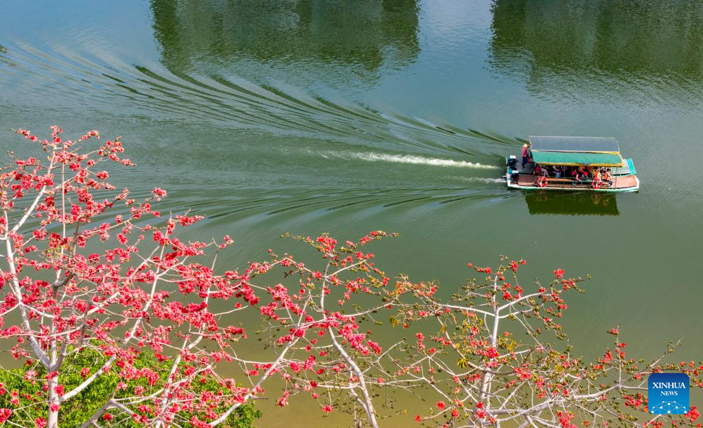 BEIJING, 27 febrero, 2026 (Xinhua) -- Vista aérea tomada con un dron el 25 de febrero de 2026 de turistas navegando en un bote en el río Wanquan, en Qionghai, en la provincia de Hainan, en el sur de China. (Xinhua/Meng Zhongde)