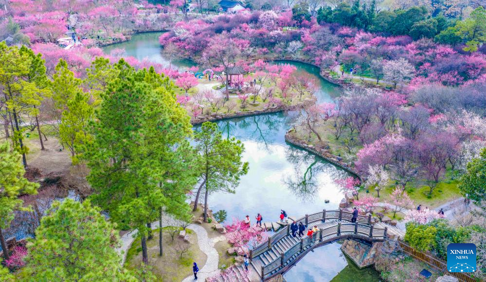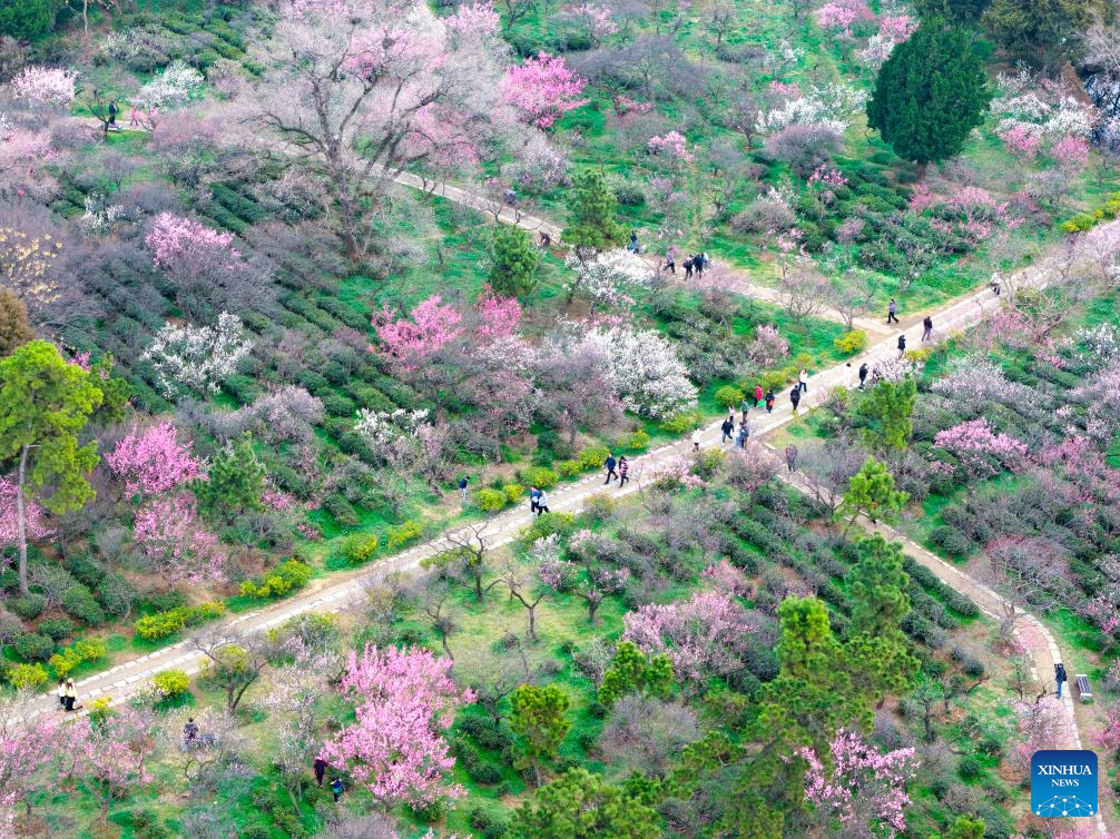 BEIJING, 27 febrero, 2026 (Xinhua) -- Vista aérea tomada con un dron el 25 de febrero de 2026 de turistas visitando la montaña Meihua en el área escénica del Mausoleo Imperial de Xiaoling de Nanjing, en la provincia de Jiangsu, en el este de China. (Xinhua/Yang Suping)