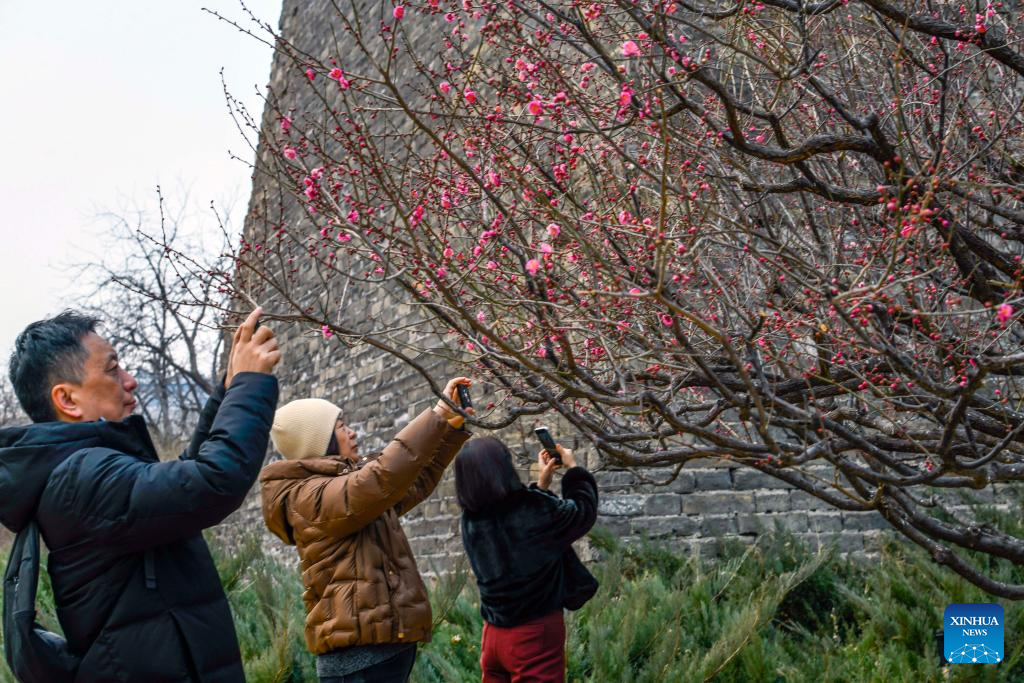 BEIJING, 27 febrero, 2026 (Xinhua) -- Imagen del 26 de febrero de 2026 de turistas tomando fotografías de flores en el parque de las ruinas de la muralla de la ciudad de la dinastía Ming, en Beijing, capital de China. (Xinhua/Liu Mancang)