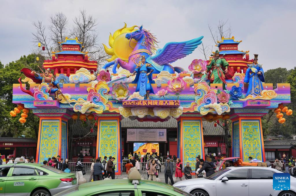CHENGDU, 27 febrero, 2026 (Xinhua) -- Personas visitan una feria del templo en el Templo de Wuhou, en Chengdu, en la provincia de Sichuan, en el suroeste de China, el 27 de febrero de 2026. La feria del templo se lleva a cabo aquí para conmemorar la Fiesta de la Primavera, o Año Nuevo chino, en curso, que finalizará el día 15 del primer mes lunar. (Xinhua/Liu Kun)