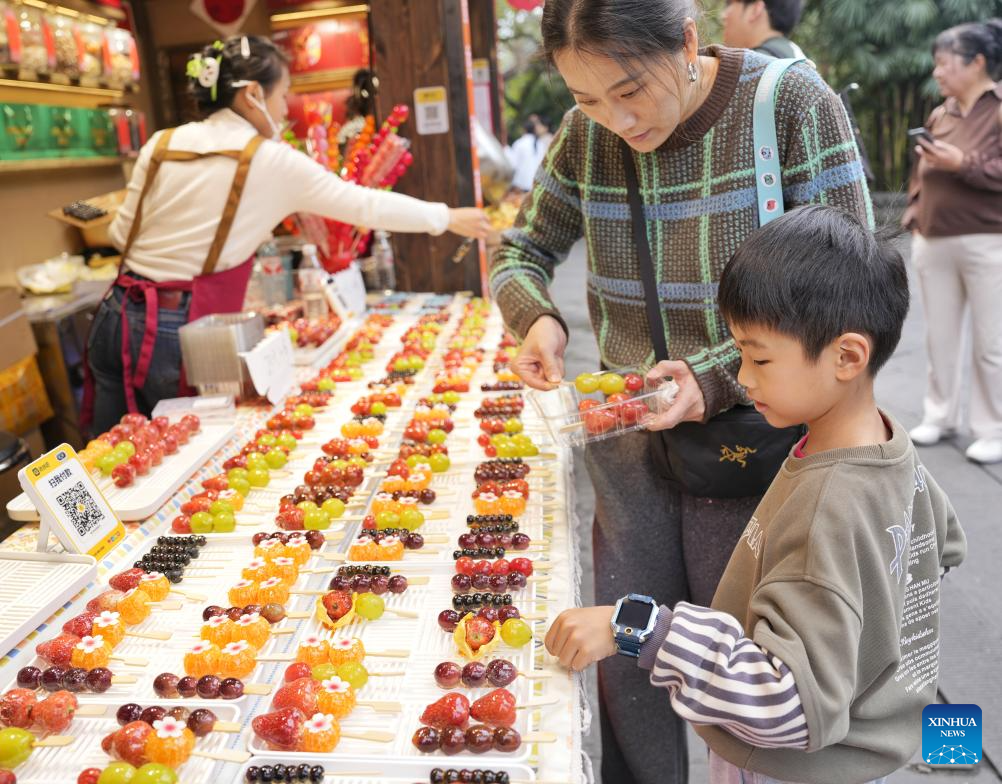 CHENGDU, 27 febrero, 2026 (Xinhua) -- Personas seleccionan frutas recubiertas de azúcar en una feria del templo en el Templo de Wuhou, en Chengdu, en la provincia de Sichuan, en el suroeste de China, el 27 de febrero de 2026. La feria del templo se lleva a cabo aquí para conmemorar la Fiesta de la Primavera, o Año Nuevo chino, en curso, que finalizará el día 15 del primer mes lunar. (Xinhua/Liu Kun)