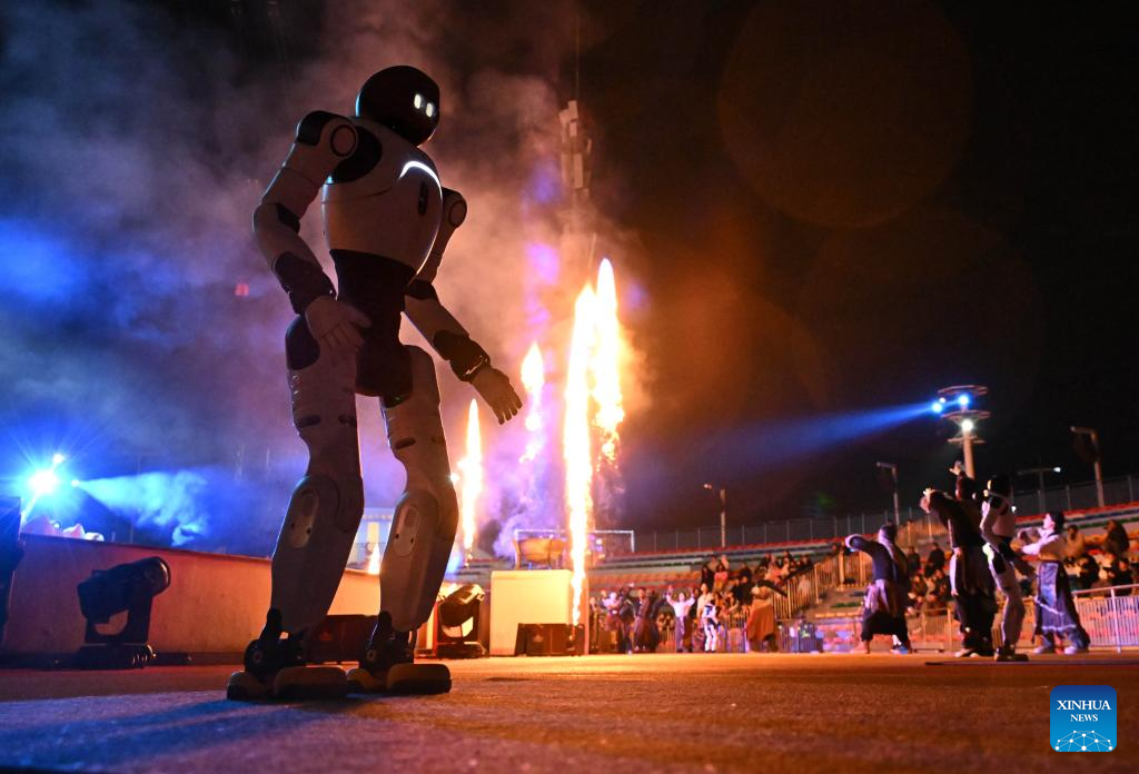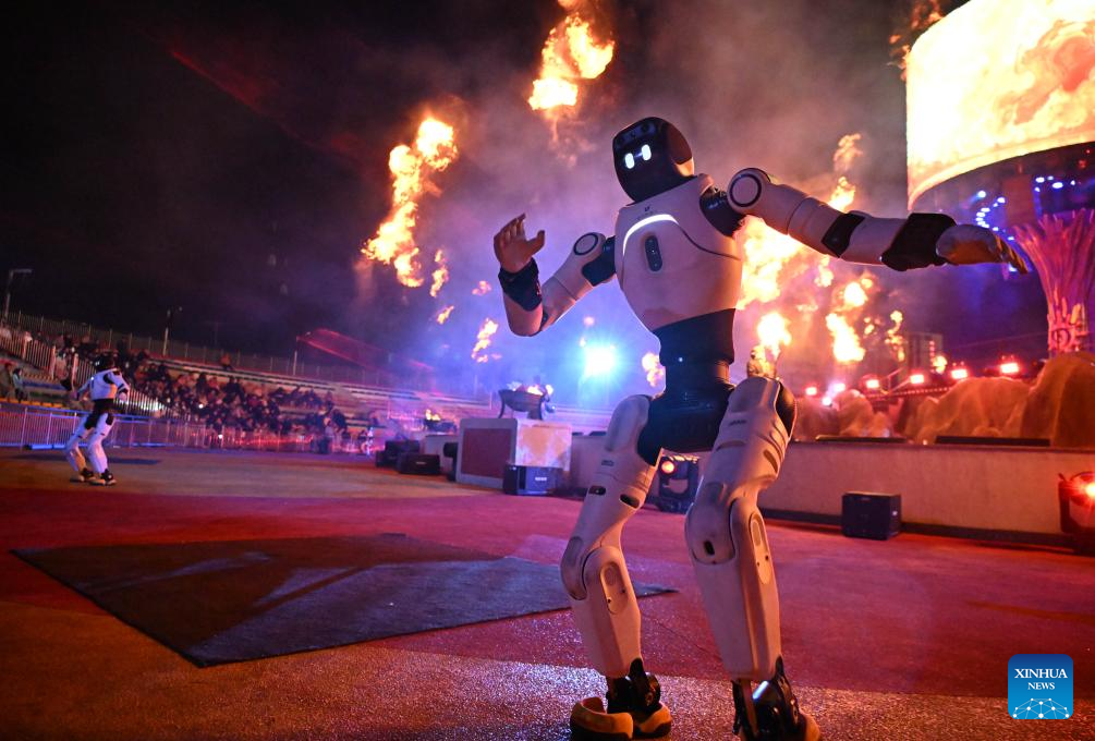 QINGDAO, 27 febrero, 2026 (Xinhua) -- Imagen del 26 de febrero de 2026 de un robot humanoide presentándose durante un espectáculo de acción en vivo con temática mítica en un área escénica, en Qingdao, en la provincia de Shandong, en el este de China. (Xinhua/Li Ziheng)