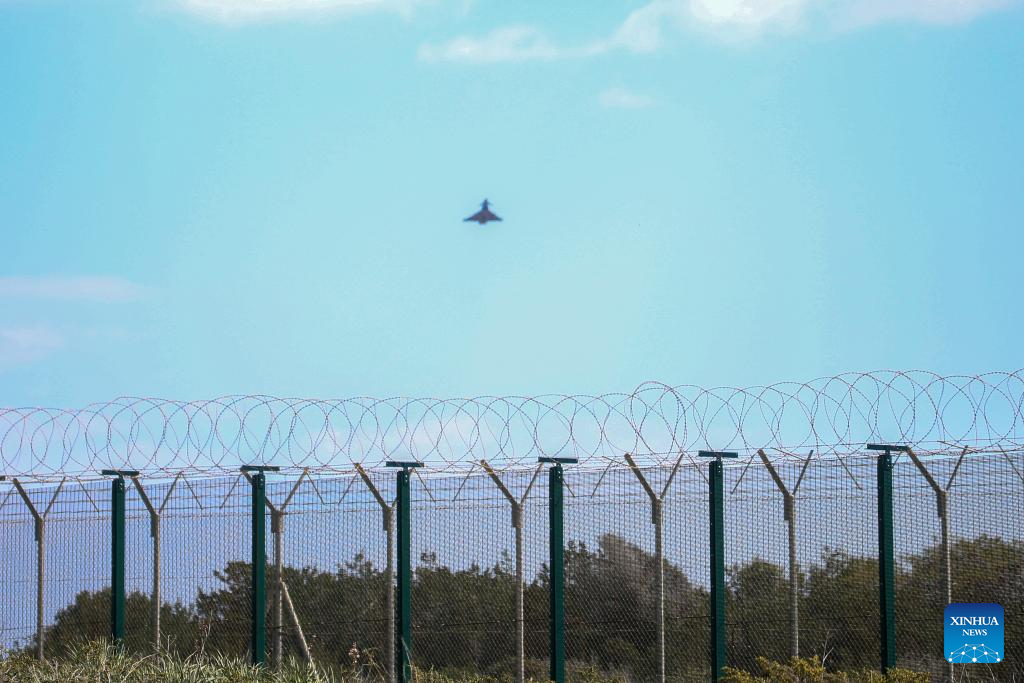 Un avión de combate militar es visto sobre la base de la Real Fuerza Aérea, en Akrotiri, Chipre, el 2 de marzo de 2026. La base aérea británica en Akrotiri, costa sur de Chipre, fue golpeada por un dron a primera hora del lunes, informaron las autoridades a cargo de esta instalación y el Gobierno chipriota. (Xinhua/George Christophorou)
