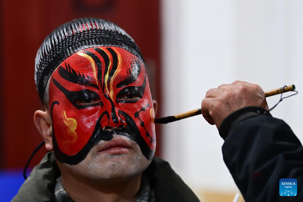 BAOJI, 2 marzo, 2026 (Xinhua) -- Un artista anciano aplica maquillaje facial para un miembro del equipo del desfile Shehuo, en la aldea Huanghuayu, en el distrito de Longxian de la ciudad de Baoji, en la provincia de Shaanxi, en el noroeste de China, en las primeras horas del 2 de marzo de 2026. Shehuo es una forma de arte folclórico tradicional chino. El distrito de Longxian celebró un desfile local especial de Shehuo el lunes, con artistas a caballo ataviados con un maquillaje facial sencillo pero exquisito. (Xinhua/Zou Jingyi)