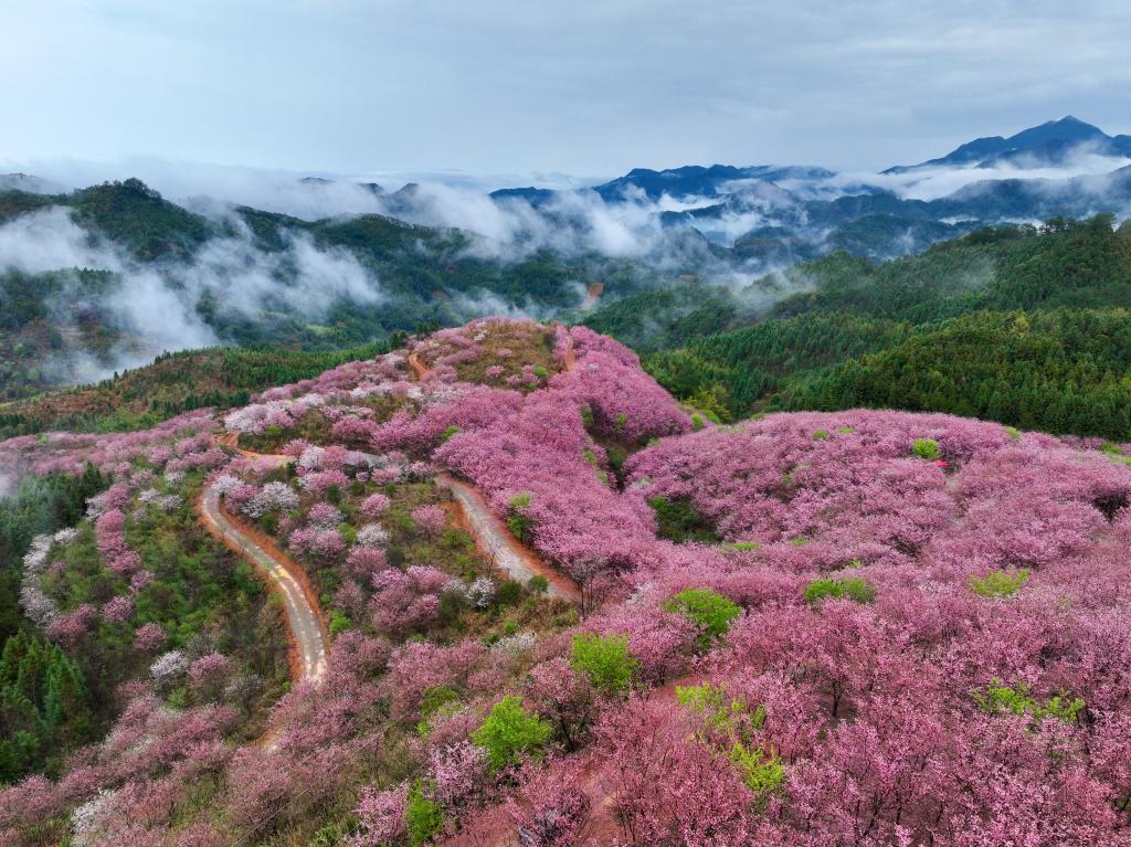 FUZHOU, 2 marzo, 2026 (Xinhua) -- Vista aérea tomada con un dron el 28 de febrero de 2026 de flores de cerezo, en el poblado de Wuling del distrito de Datian, en la provincia de Fujian, en el sureste de China. En Fujian, los jardines de té y las áreas montañosas adornadas con flores de cerezo han ganado popularidad como destinos turísticos a principios de la primavera. En los últimos años, el departamento forestal provincial ha desarrollado un sistema diverso de flores de cerezos con variedades de floración temprana, media y tardía, aprovechando al máximo las especies nativas y a través de años de introducción y cultivo. Este sistema apoya el crecimiento del turismo distintivo de las flores de cerezo y dinamiza efectivamente la "economía de primavera" de la región. (Xinhua/Jiang Kehong)