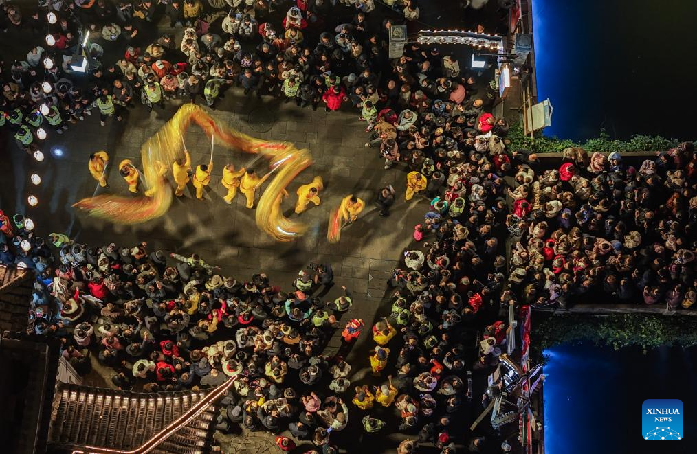 BEIJING, 3 marzo, 2026 (Xinhua) -- Vista aérea tomada con un dron el 3 de marzo de 2026 de personas observando una danza del dragón en celebración del Festival de las Linternas, en el poblado de Shouchang, en la ciudad de Jiande, en la provincia de Zhejiang, en el este de China. (Xinhua/Xu Yu)