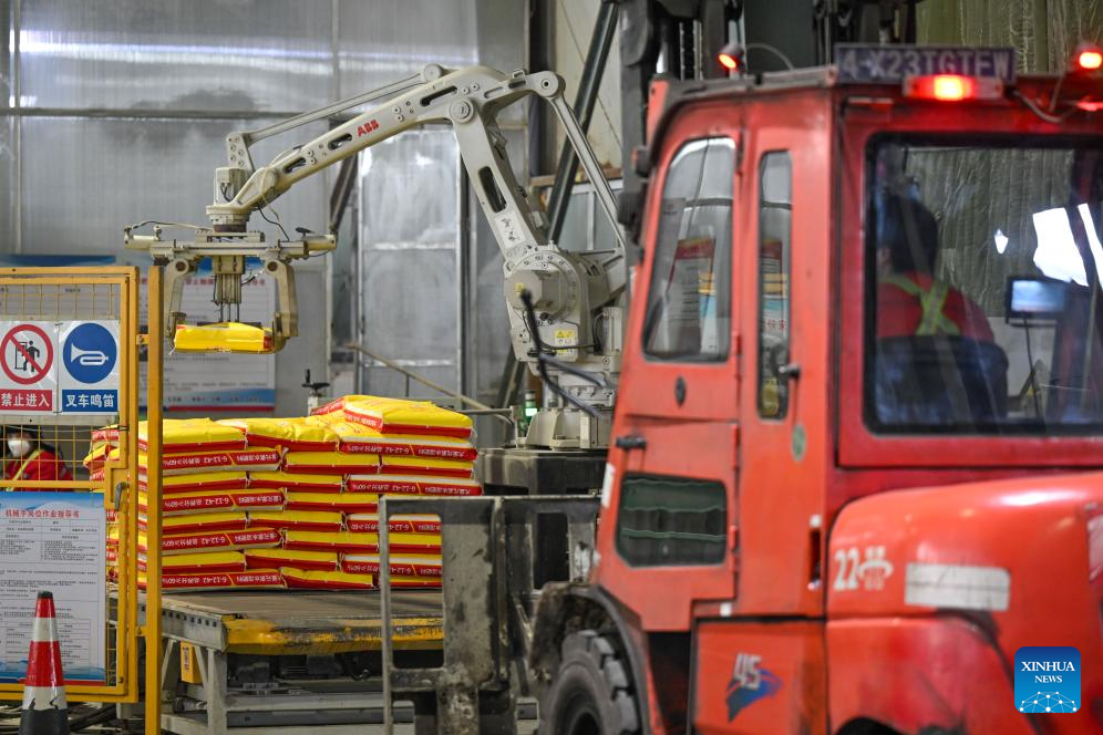 MANAS, 6 marzo, 2026 (Xinhua) -- Imagen del 4 de marzo de 2026 de un robot paletizador automático trabajando en la línea de producción de una empresa de fertilizantes, en el distrito de Manas de la prefectura autónoma de la etnia hui de Changji, en la región autónoma uygur de Xinjiang, en el noroeste de China. Los fabricantes de suministros agrícolas de Xinjiang trabajan a plena capacidad para cumplir con los pedidos y garantizar un flujo constante de fertilizantes y materiales para la agricultura de primavera. (Xinhua/Ding Lei)