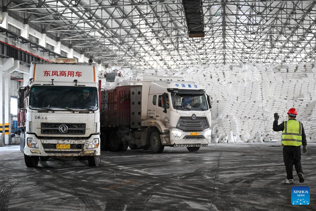 MANAS, 6 marzo, 2026 (Xinhua) -- Imagen del 5 de marzo de 2026 de camiones esperando por carga en una empresa de fertilizantes, en el distrito de Manas de la prefectura autónoma de la etnia hui de Changji, en la región autónoma uygur de Xinjiang, en el noroeste de China. Los fabricantes de suministros agrícolas de Xinjiang trabajan a plena capacidad para cumplir con los pedidos y garantizar un flujo constante de fertilizantes y materiales para la agricultura de primavera. (Xinhua/Ding Lei)