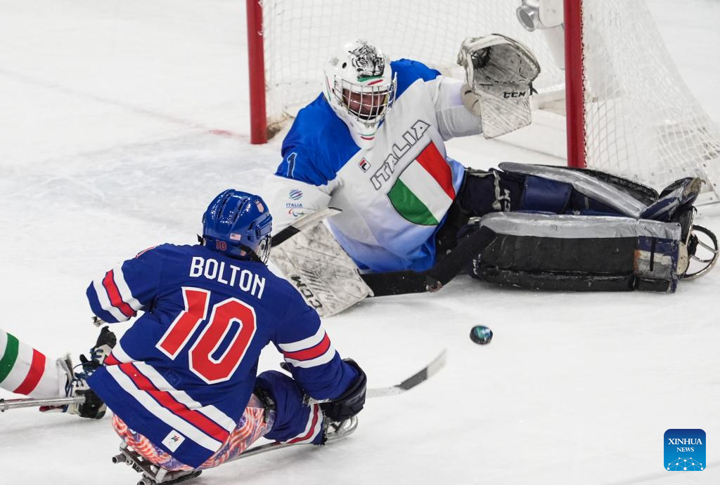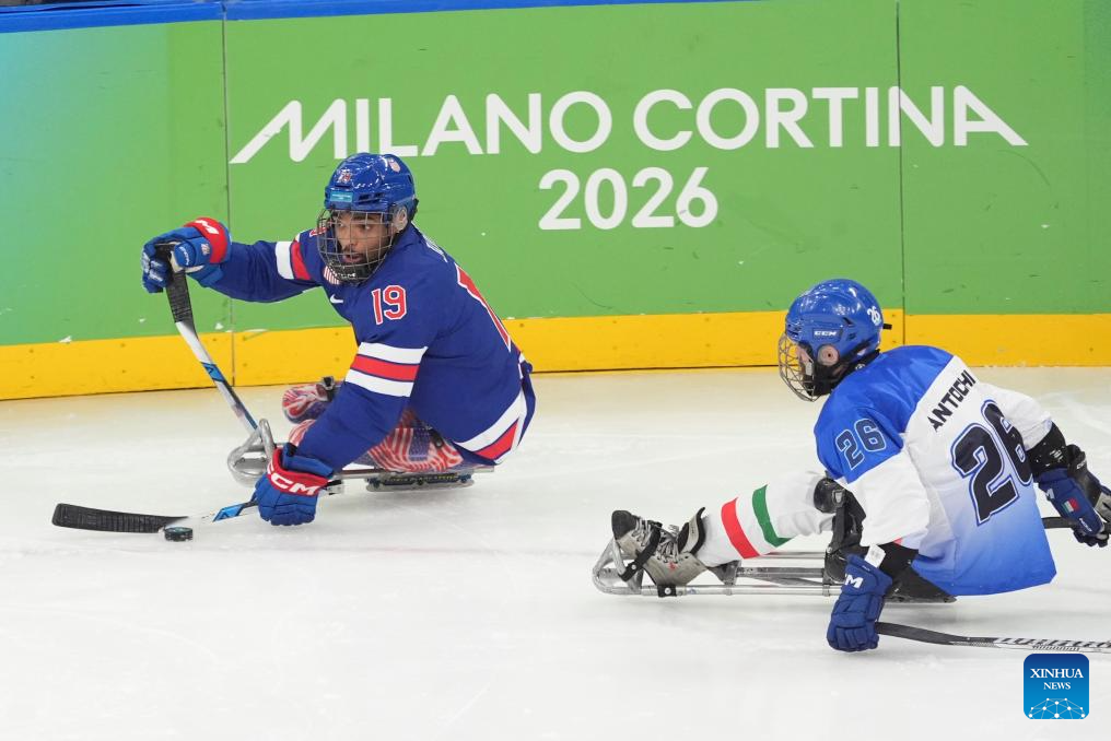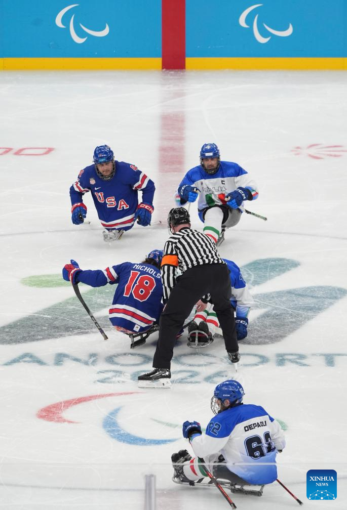 MILAN, 8 marzo, 2026 (Xinhua) -- Imagen del 7 de marzo de 2026 de jugadores de ambos equipos compitiendo durante el partido de la ronda preliminar del Grupo A entre Estados Unidos e Italia de para hockey sobre hielo en los Juegos Paralímpicos de Invierno Milán-Cortina 2026, en Milán, Italia. (Xinhua/Hou Jun)