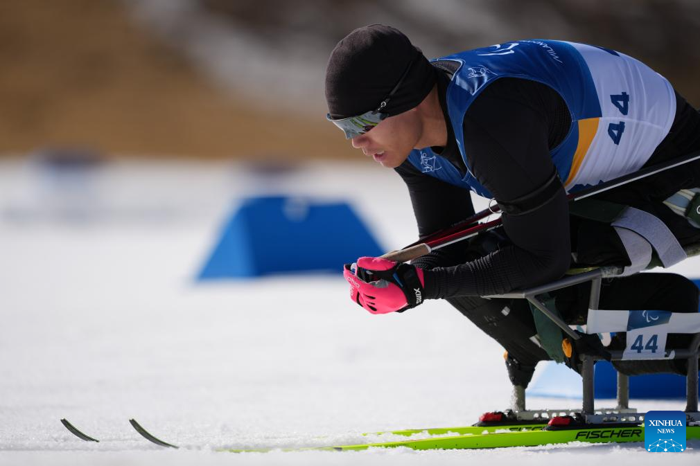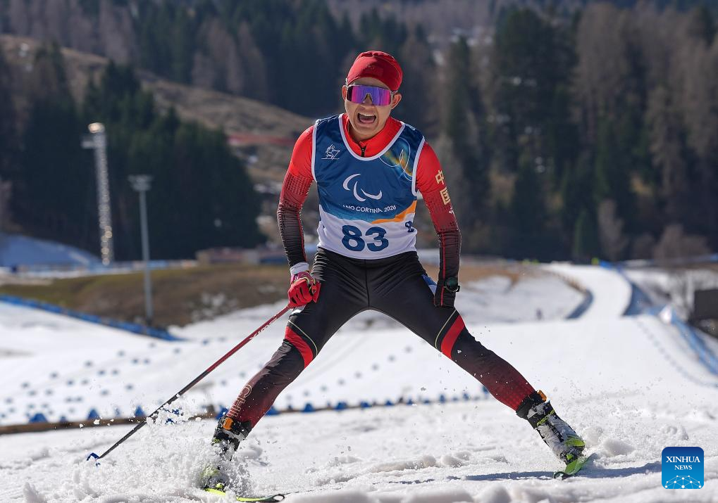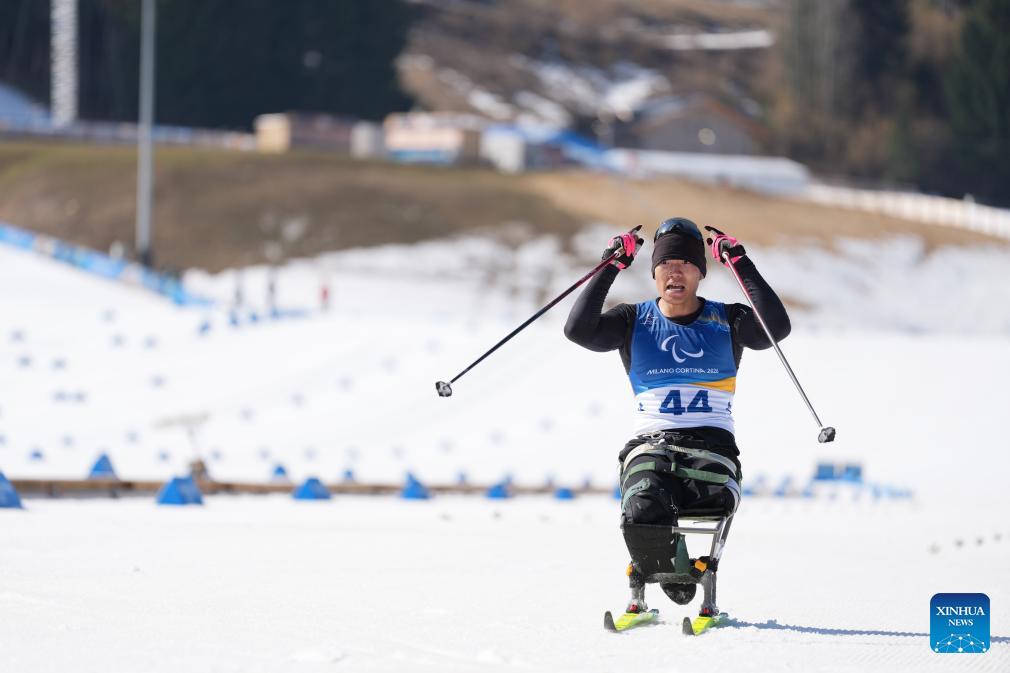 TESERO, 8 marzo, 2026 (Xinhua) -- Imagen del 7 de marzo de 2026 de Cai Jiayun, de China, cruzando la línea de meta durante el esprint masculino de para biatlón en los Juegos Paralímpicos de Invierno Milán-Cortina 2026, en Tesero, Italia. (Xinhua/Hou Zhaokang)