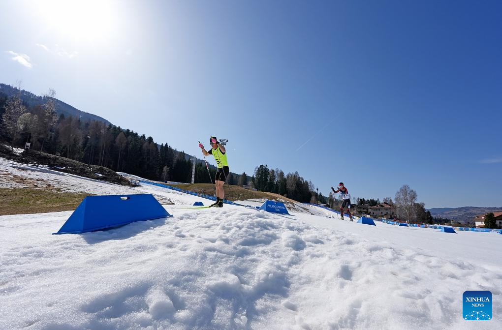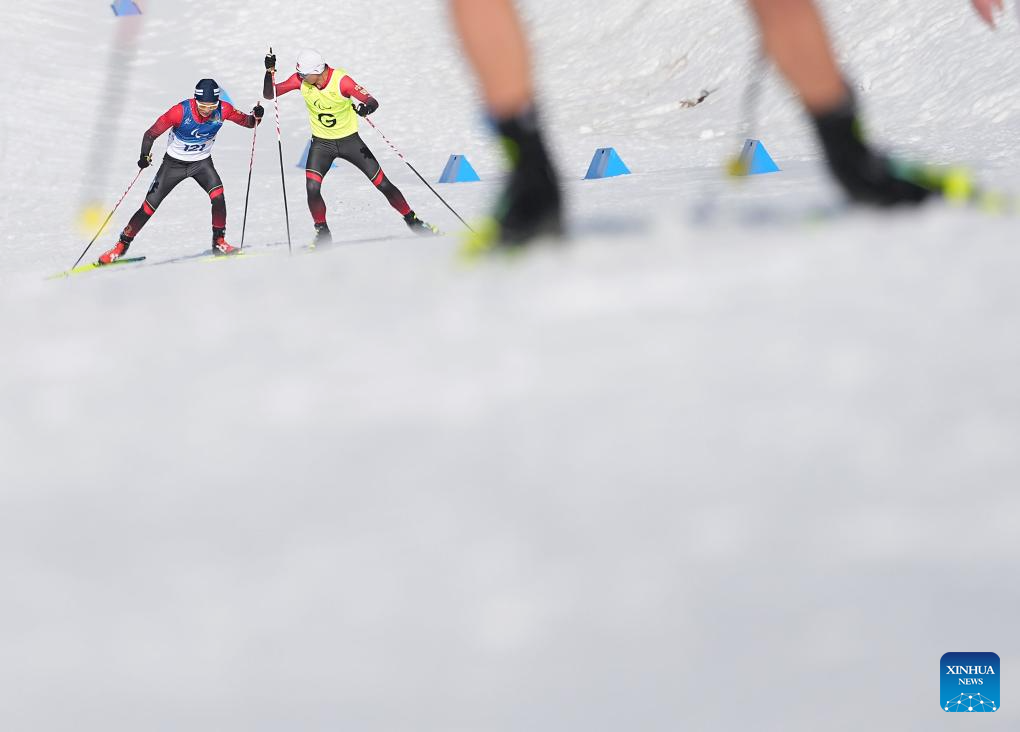 TESERO, 8 marzo, 2026 (Xinhua) -- Dang Hesong (i), y su guía Lu Hongda, de China, compiten durante la final de individual masculino con discapacidad visual de para biatlón en los Juegos Paralímpicos de Invierno Milán-Cortina 2026, en Tesero, Italia, el 8 de marzo de 2026. (Xinhua/Hou Zhaokang)