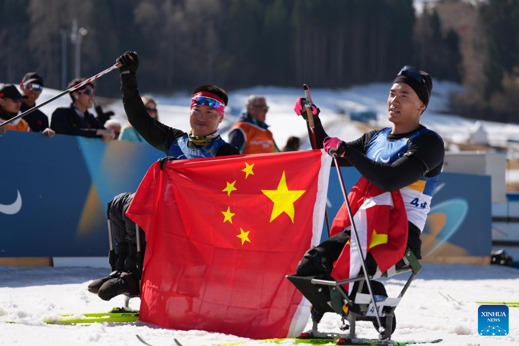 TESERO, 8 marzo, 2026 (Xinhua) -- Liu Zixu (d), y Mao Zhongwu, de China, festejan al término de la final de individual masculino sentado de para biatlón en los Juegos Paralímpicos de Invierno Milán-Cortina 2026, en Tesero, Italia, el 8 de marzo de 2026. (Xinhua/Lian Zhen)