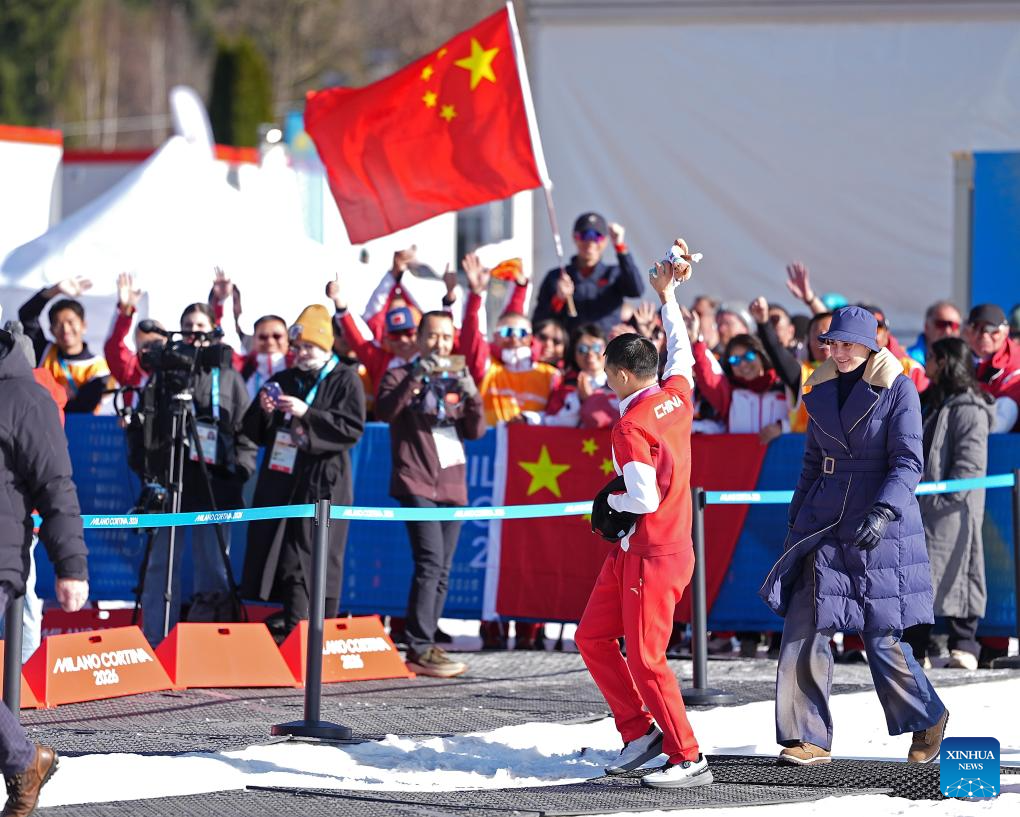 TESERO, 8 marzo, 2026 (Xinhua) -- Imagen del 7 de marzo de 2026 del medallista de oro, Cai Jiayun (i), de China, saludando al término de la ceremonia de premiación del esprint masculino de para biatlón en los Juegos Paralímpicos de Invierno Milán-Cortina 2026, en Tesero, Italia. (Xinhua/Hou Zhaokang)