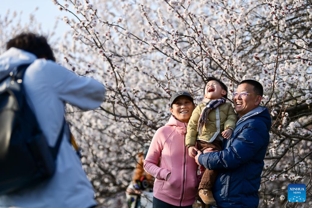 XI'AN, 9 marzo, 2026 (Xinhua) -- Turistas posan para fotografías con árboles en flor en el Parque del Patrimonio Nacional del Palacio Daming, en Xi'an, en la provincia de Shaanxi, en el noroeste de China, el 9 de marzo de 2026. Las flores retoñan mientras la temperatura incrementa en China. (Xinhua/Zou Jingyi)