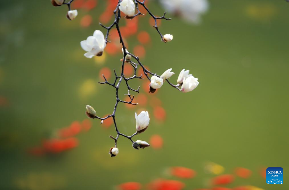 BEIJING, 12 marzo, 2026 (Xinhua) -- Imagen del 10 de marzo de 2026 de flores de magnolia vistas con peces en el fondo en el punto escénico de Heyuan, en la ciudad de Yangzhou, en la provincia de Jiangsu, en el este de China. (Xinhua/Meng Delong)