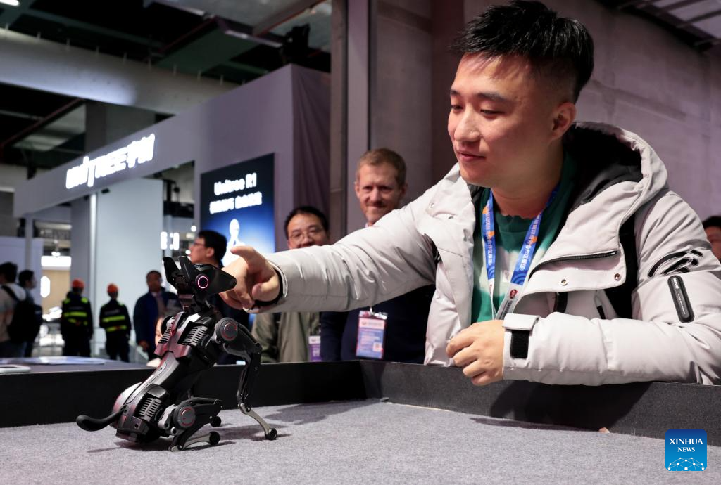 SHANGHAI, 12 marzo, 2026 (Xinhua) -- Un visitante interactúa con un perro robótico durante la Exposición Mundial de Electrodomésticos y Electrónica 2026 (AWE2026, por sus siglas en inglés), en Shanghai, en el este de China, el 12 de marzo de 2026. La AWE2026 comenzó en Shanghai el jueves. Más de 1.200 empresas de todo el mundo se reunieron en la exposición para presentar sus últimas innovaciones. (Xinhua/Fang Zhe)