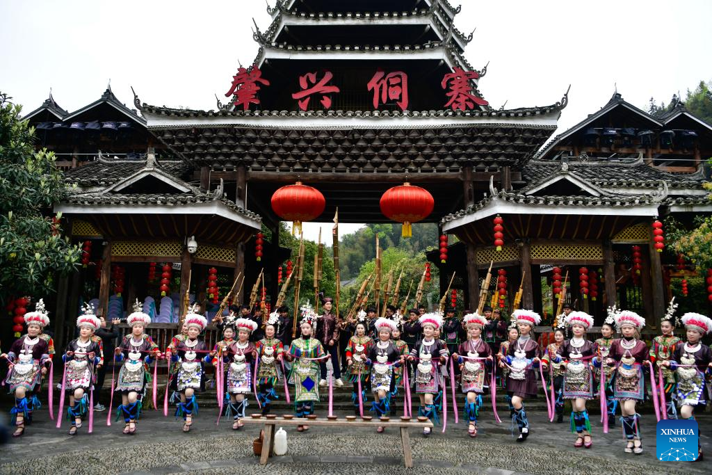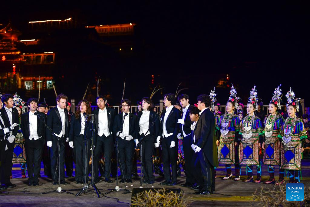 LIPING, 24 marzo, 2026 (Xinhua) -- Imagen del 23 de marzo de 2026 de residentes locales dando la bienvenida a los invitados, en la aldea dong de Zhaoxing, en el distrito de Liping, en la provincia de Guizhou, en el suroeste de China. El coro a capela The Whiffenpoofs de la Universidad de Yale visitó el distrito de Liping, en la provincia de Guizhou, en el suroeste de China, del 23 al 24 de marzo para participar en actividades de intercambio cultural. (Xinhua/Yang Wenbin)