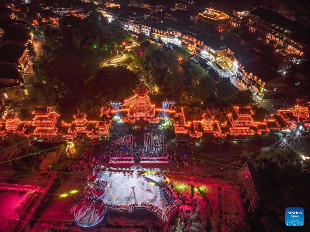 LIPING, 24 marzo, 2026 (Xinhua) -- Vista aérea tomada con un dron el 23 de marzo de 2026 de una vista de una gala de intercambio cultural, en la aldea dong de Zhaoxing, en el distrito de Liping, en la provincia de Guizhou, en el suroeste de China. El coro a capela The Whiffenpoofs de la Universidad de Yale visitó el distrito de Liping, en la provincia de Guizhou, en el suroeste de China, del 23 al 24 de marzo para participar en actividades de intercambio cultural. (Xinhua/Yang Wenbin)