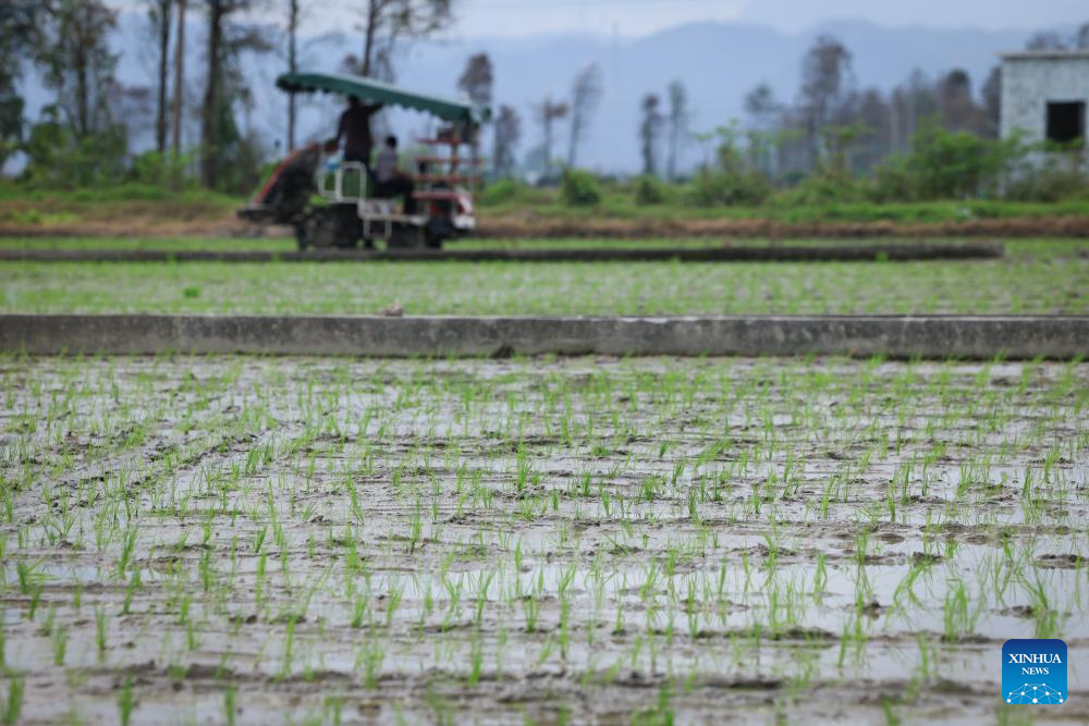 JIANGMEN, 25 marzo, 2026 (Xinhua) -- Imagen del 24 de marzo de 2026 de trabajadores operando trasplantadoras de arroz para trasplantar plántulas de arroz en el campo, en el poblado de Duhu de Taishan, en la provincia de Guangdong, en el sur de China. En los últimos años, Taishan ha estado promoviendo la transformación de la agricultura tradicional en un "cultivo inteligente de cereales" a través del empoderamiento tecnológico. (Xinhua/Mao Siqian)