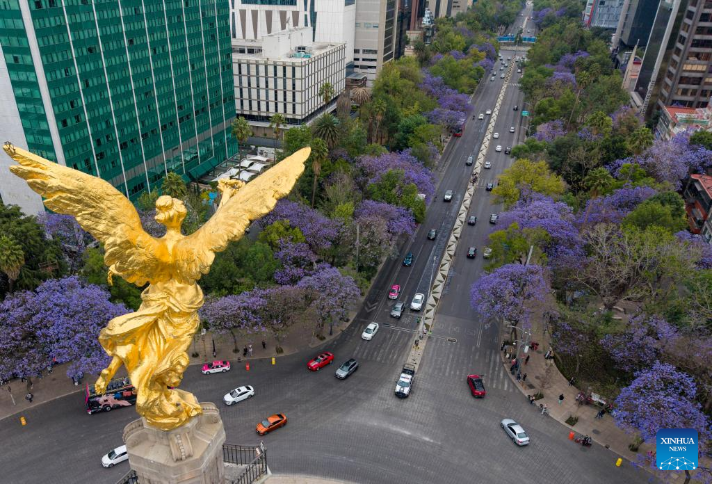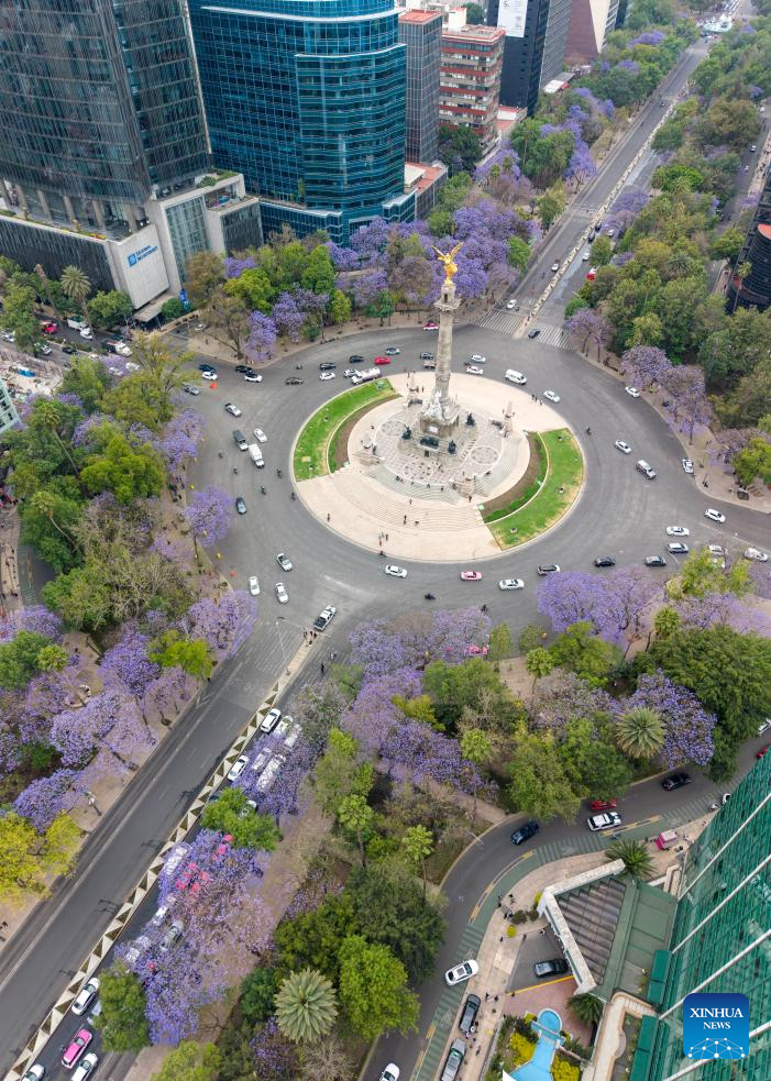 CIUDAD DE MEXICO, 26 marzo, 2026 (Xinhua) -- Vista aérea tomada con un dron el 24 de marzo de 2026 del Angel de la Independencia y árboles de jacaranda en la avenida Paseo de la Reforma, en la Ciudad de México, capital de México. (Xinhua/Qi Xiaoyi)