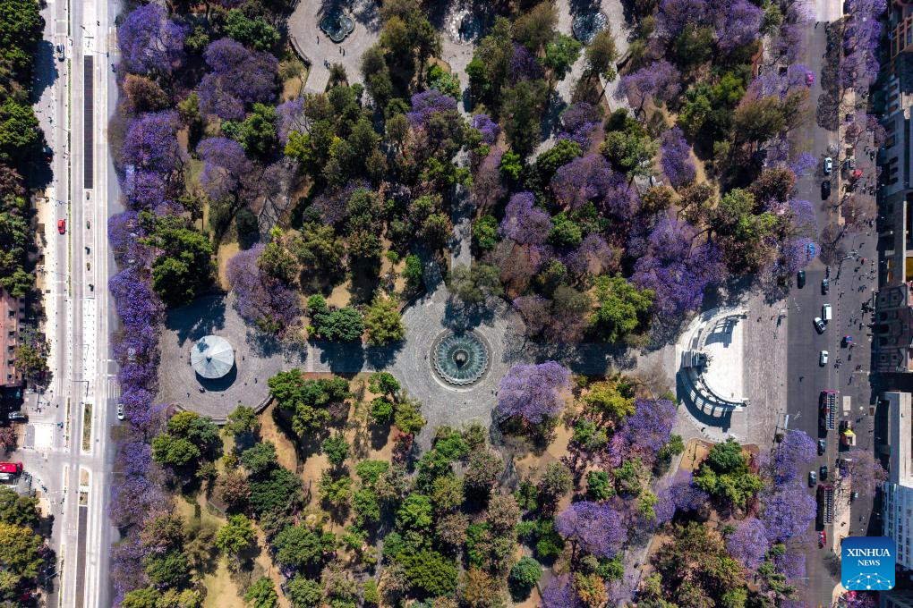 CIUDAD DE MEXICO, 26 marzo, 2026 (Xinhua) -- Vista aérea tomada con un dron el 24 de marzo de 2026 de árboles de jacaranda en la avenida Paseo de la Reforma, en la Ciudad de México, capital de México. (Xinhua/Qi Xiaoyi)