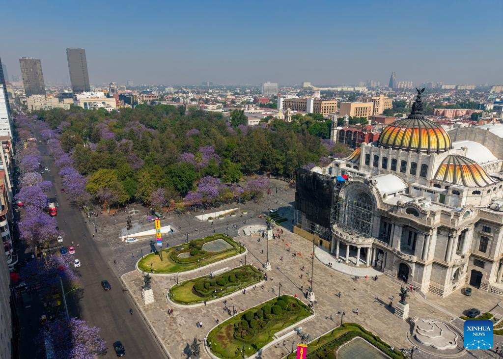 CIUDAD DE MEXICO, 26 marzo, 2026 (Xinhua) -- Imagen tomada con un dron el 25 de marzo de 2026 del Palacio de Bellas Artes y árboles de jacaranda, en la Ciudad de México, capital de México. (Xinhua/Qi Xiaoyi)
