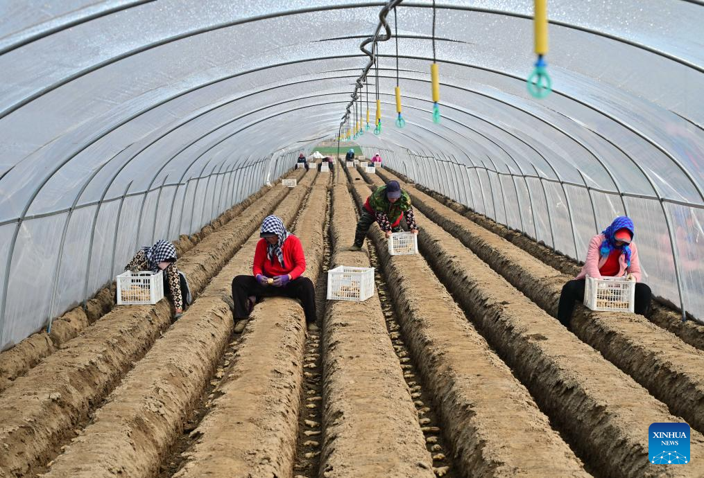 TANGSHAN, 26 marzo, 2026 (Xinhua) -- Agricultores plantan jengibre en un invernadero, en el poblado de Daxinzhuang del distrito de Fengnan, en Tangshan, en la provincia de Hebei, en el norte de China, el 26 de marzo de 2026. La agricultura de primavera está en pleno apogeo en Fengnan a medida que el clima se calienta. (Xinhua/Yang Shiyao)