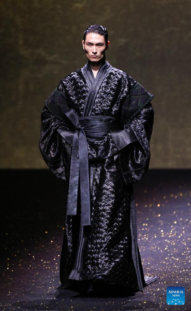 SHANGHAI, 26 marzo, 2026 (Xinhua) -- Un modelo presenta una creación de HEMU durante la Semana de la Moda de Shanghai Otoño/Invierno 2026, en Shanghai, en el este de China, el 26 de marzo de 2026. (Xinhua/Chen Haoming)