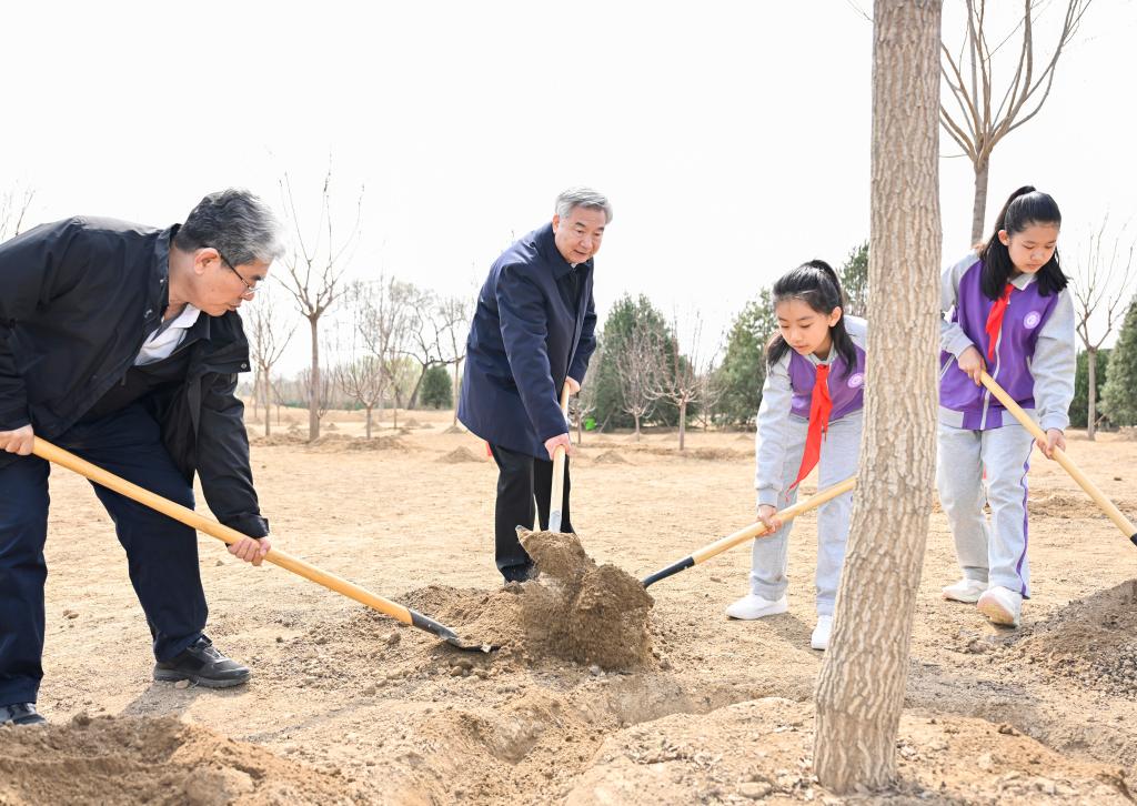 Wang Huning planta un árbol durante una actividad voluntaria de plantación de árboles, en el poblado de Baishan, en el distrito de Changping de Beijing, capital de China, el 30 de marzo de 2026. Los líderes del Partido y del Estado Xi Jinping, Li Qiang, Zhao Leji, Wang Huning, Cai Qi, Ding Xuexiang, y Li Xi participaron en una actividad voluntaria de plantación de árboles en el distrito de Changping de Beijing el lunes. (Xinhua/Huang Jingwen)