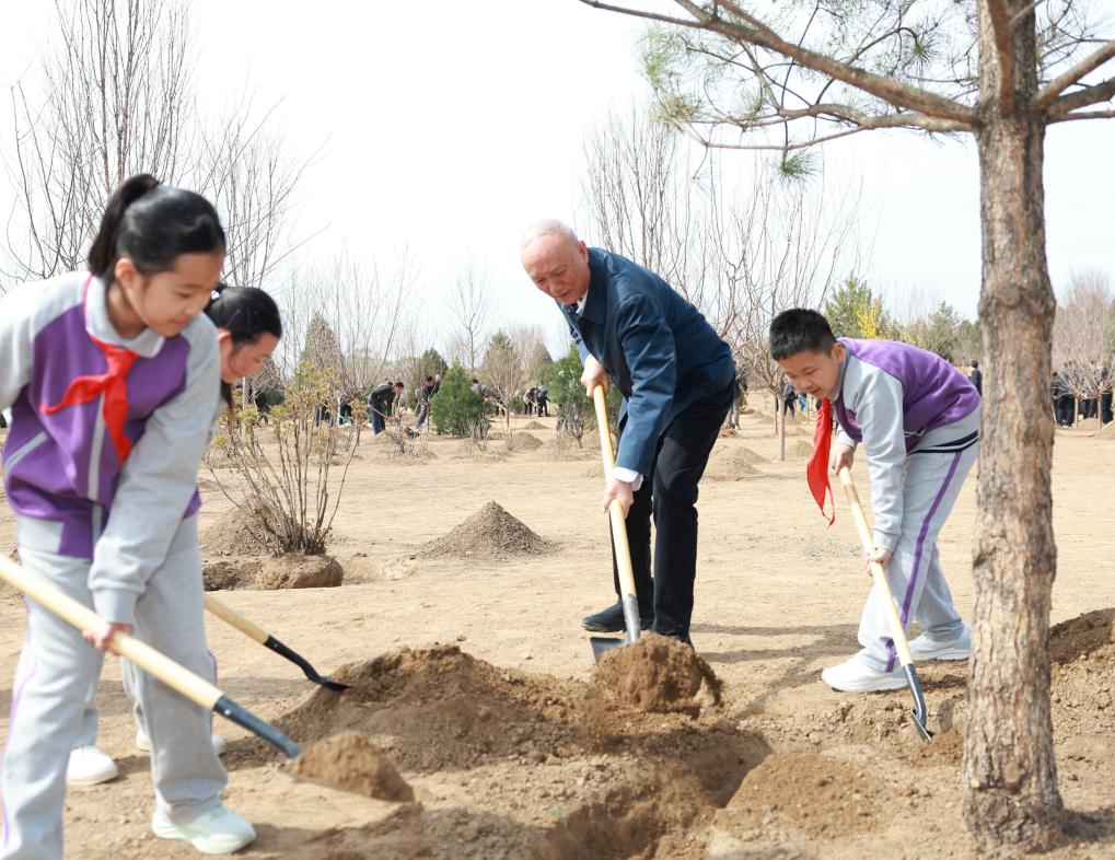 Cai Qi planta un árbol durante una actividad voluntaria de plantación de árboles, en el poblado de Baishan, en el distrito de Changping de Beijing, capital de China, el 30 de marzo de 2026. Los líderes del Partido y del Estado Xi Jinping, Li Qiang, Zhao Leji, Wang Huning, Cai Qi, Ding Xuexiang, y Li Xi participaron en una actividad voluntaria de plantación de árboles en el distrito de Changping de Beijing el lunes. (Xinhua/Ding Haitao)