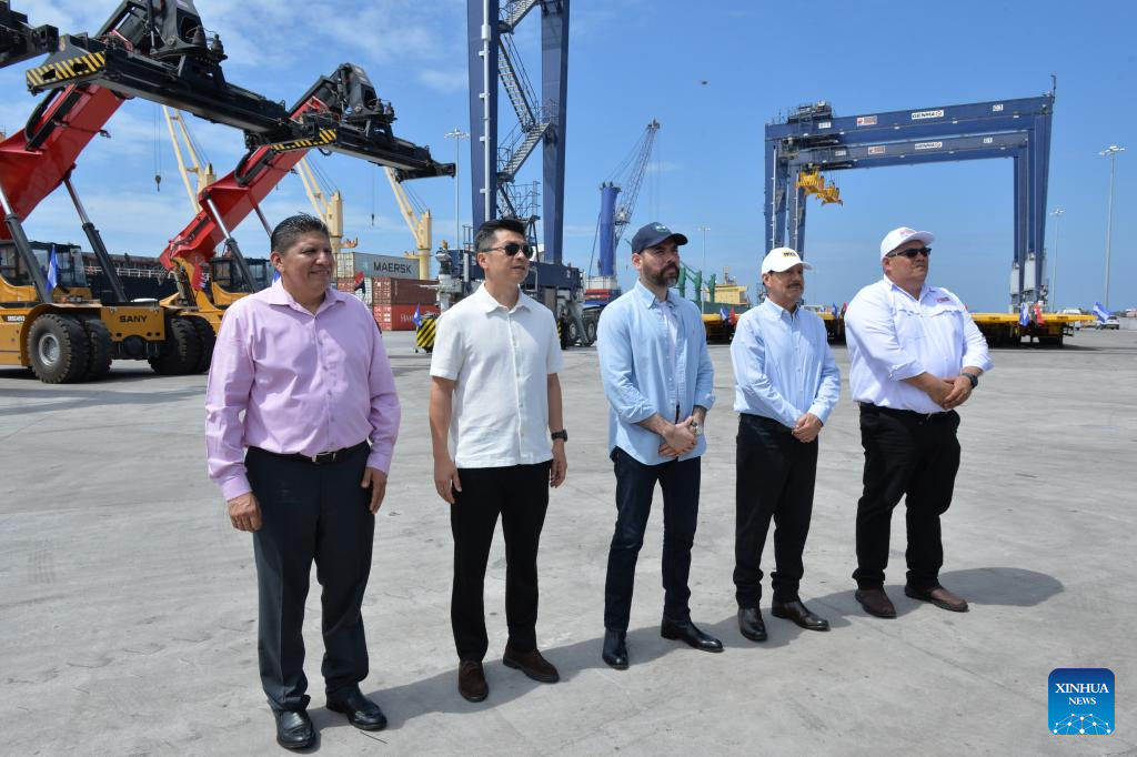 CORINTO, 30 marzo, 2026 (Xinhua) -- Imagen del 25 de marzo de 2026 del asesor presidencial para Inversiones, Comercio y Cooperación Internacional de Nicaragua, Laureano Ortega (c), el ministro de Transporte de Nicaragua, Oscar Mojica (2-d), y el embajador de China en Nicaragua, Qu Yuhui (2-i), asistiendo a la supervisión de la instalación de la nueva maquinaria en una terminal portuaria, en Corinto, Nicaragua. Nicaragua modernizó su principal puerto en el Pacífico, Corinto, con ayuda financiera y técnica de China, en un esfuerzo por ampliar su capacidad logística y fortalecer su inserción en el comercio global. (Xinhua/Noelia Aráuz)