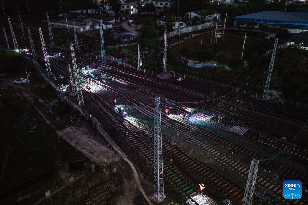 DUYUN, 31 marzo, 2026 (Xinhua) -- Imagen del 30 de marzo de 2026 de trabajadores ferroviarios atareados en el proyecto de mejora de la estación de Lyuyinhu a lo largo de la línea de extensión sur-norte del Ferrocarril Weng'an-Machangping, en la provincia de Guizhou, en el suroeste de China. La modernización de la estación de Lyuyinhu concluyó el lunes, estableciendo una base sólida para la plena operación de la línea de extensión sur-norte del Ferrocarril Weng'an-Machangping. La línea de extensión de 148 kilómetros de longitud es un proyecto clave para el transporte ferroviario de mercancías en la provincia de Guizhou. (Xinhua/Yang Wenbin)