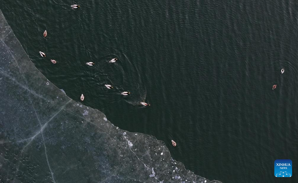 HARBIN, 1 abril, 2026 (Xinhua) -- Vista aérea tomada con un dron el 30 de marzo de 2026 de aves migratorias descansando en la sección de Harbin del río Songhua, en la provincia de Heilongjiang, en el noreste de China. (Xinhua/Zhang Shu)