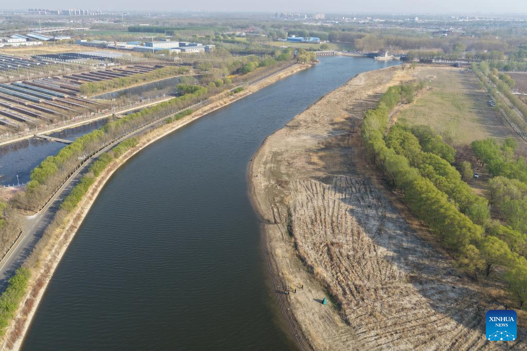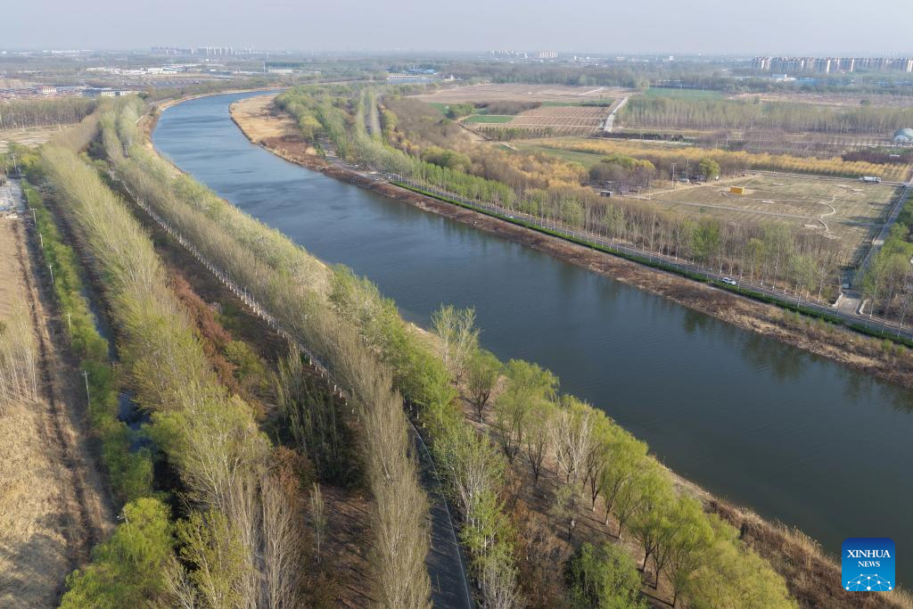 TIANJIN, 4 abril, 2026 (Xinhua) -- Vista aérea tomada con un dron el 4 de abril de 2026 del paisaje de primavera en el tramo de Wuqing del Gran Canal, en Tianjin, en el norte de China. El Gran Canal, que conecta Beijing, en el norte de China, con la ciudad de Hangzhou, en el este del país, cuenta con más de 2.500 años de historia y es conocido como la vía fluvial artificial más larga del mundo. (Xinhua/Xing Guangli)