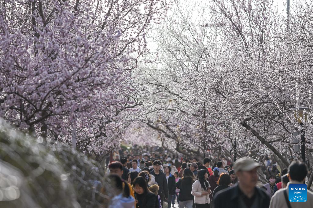 HOHHOT, 4 abril, 2026 (Xinhua) -- Turistas disfrutan de las flores de durazno en un parque, en Hohhot, en la región autónoma de Mongolia Interior, en el norte de China, el 4 de abril de 2026. (Xinhua/Lian Zhen)