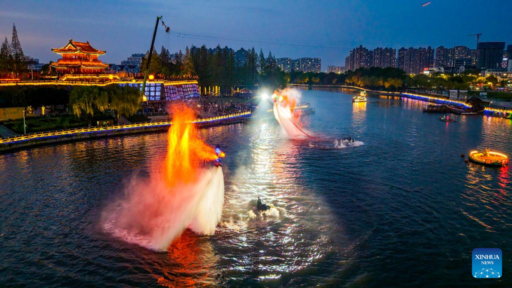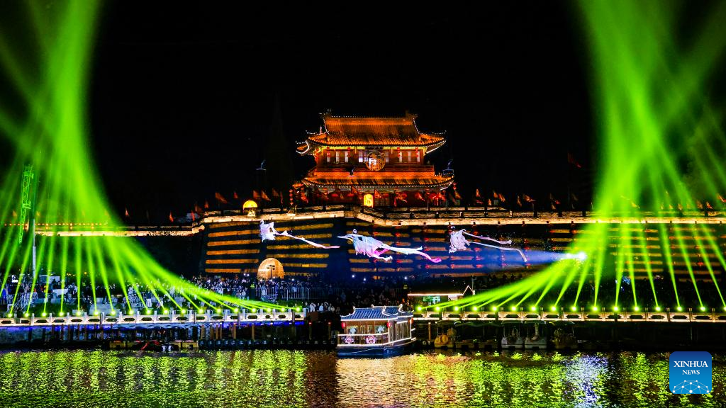 JINGZHOU, 4 abril, 2026 (Xinhua) -- Imagen del 3 de abril de 2026 de una presentación llevada a cabo, en las afueras de la ciudad antigua de Jingzhou, en la provincia de Hubei, en el centro de China. El espectáculo, cuyo objetivo era impulsar el turismo cultural primaveral se representó aquí el viernes por la noche y atrajo a muchos visitantes. (Xinhua/Zhang Mengyao)
